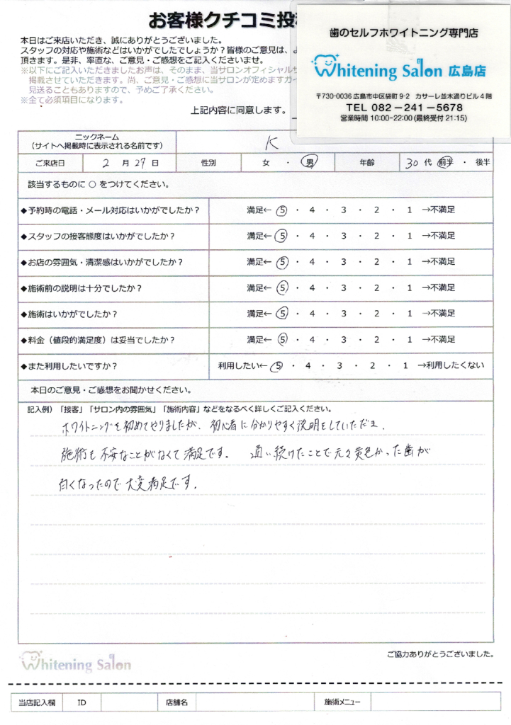 ホワイトニングを初めてやりましたが、初心者に分かりやすく説明をしていただき、施術も不安なことがなくて満足です。