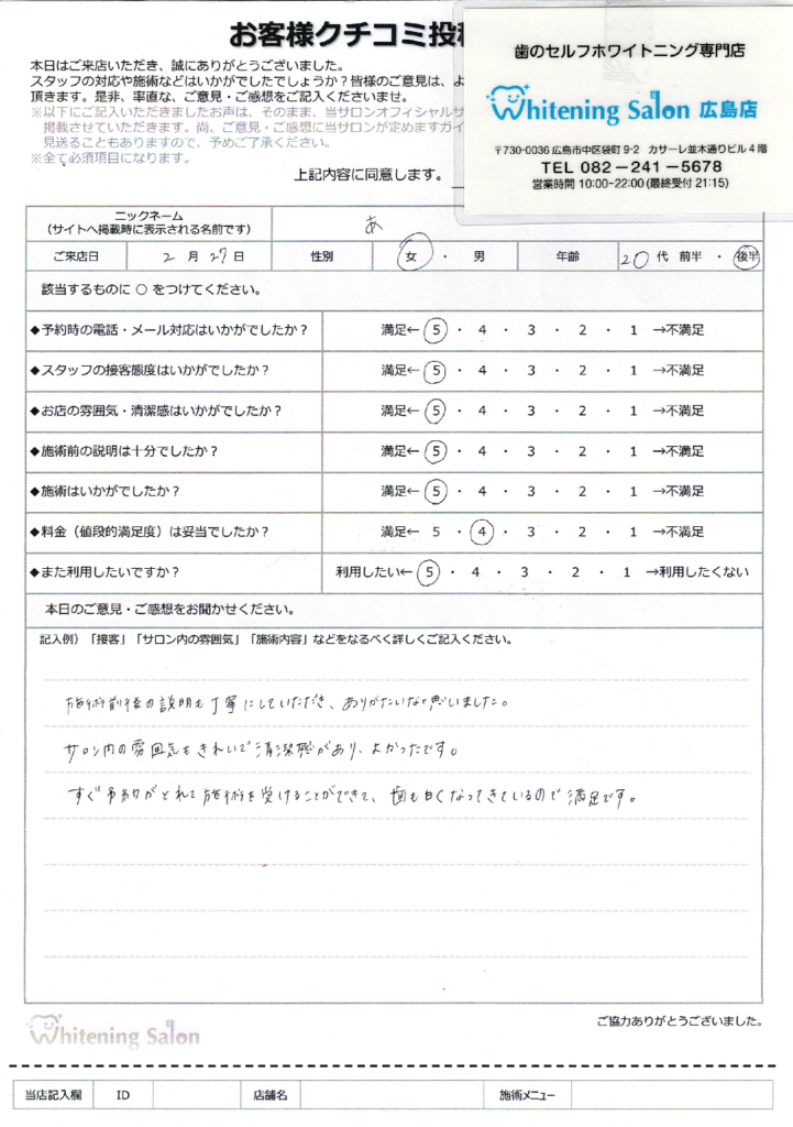 スタッフの方の説明も分かりやすく、とても優しかったです。サロン内の雰囲気はきれいで流れている音楽によりリラックスできました。フリーパスでとても満足のいく白さになって嬉しいです。