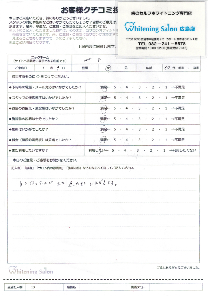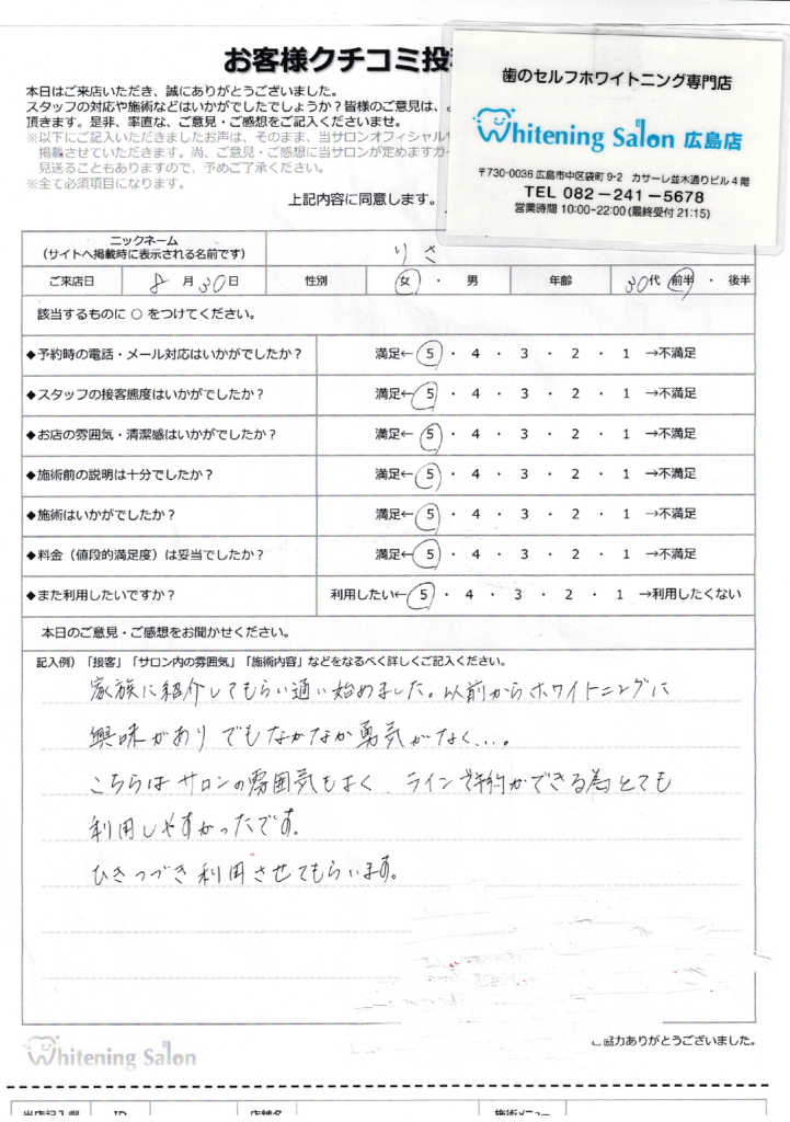 前日まで予定がはっきりしない方も安心して通えると思います。また、サロン内は清潔に保たれており、スタッフさんも仕事が丁寧な方ばかりで気持ち良くホワイトニングに取り組むことができました。ありがとうございました。