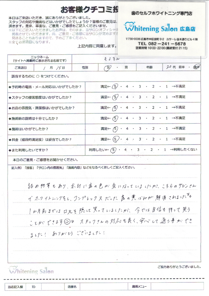 きょうせいが終わってホワイトニングサロンを調べてた時に、ホワイトニングサロンさんが出てきて行くことになりました。自分が思っていたよりも歯が白くなって今では自信をもって笑うことができます!!接客も皆さんやさしくて居心地よかったです。