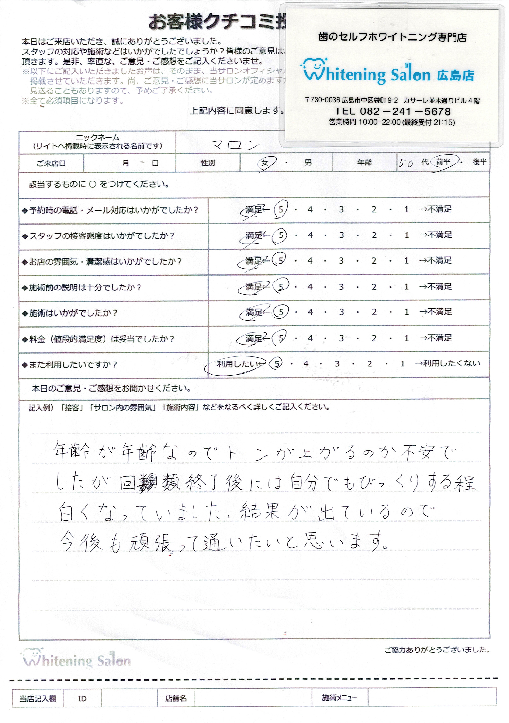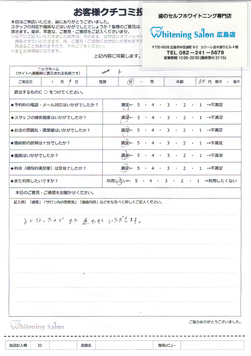 スタッフの方の説明も分かりやすく、とても優しかったです。サロン内の雰囲気はきれいで流れている音楽によりリラックスできました。フリーパスでとても満足のいく白さになって嬉しいです。